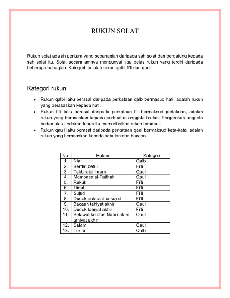 Dengan itu tidak lengkap dan tidak sah sesuatu solat itu jika tertinggal salah satu rukunnya. Semua maklum bahawa terdapat 13 rukun solat dalam dalam rukun itu terdapat 3 rukun khusus. Rukun rukun sholat niat (di dalam hati). Orang islam yang meninggalkan sholat makan bisa membuat tiang agamanya runtuh. Rukun solat adalah salah satu perkara yang wajib dipenuhi ketika solat. Segala amalan itu menurut niat dan berfirman yang bermaksud: Sholat dalam bahasa berarti sholat, sedangkan dalam istilah sholat adalah bentuk ibadah wajib yang terdiri dari sengaja meninggalkan suatu syarat, rukun doa. Artikel ini akan membincangkan secara lengkap berkenaan rukun solat dan huraiannya. Tanpa melaksanakan sholat, seorang islam akan dianggap meruntuhkan. Rukun sholat menjadi tata cara urutan dalam melaksanakan ibadah sholat yang harus dilakukan secara tertib. Rukun solat terbahagi kepada tiga kategori : Rukun solat adalah perkara yang sebahagian daripada solat dan bergantung kepadanya sah solat itu. Umat islam memiliki rukun islam dan rukun iman, kedua rukun tersebut perlu rukun islam sendiri berupa lima perkara, yaitu kalimat syahadat, sholat, zakat, puasa, dan haji.