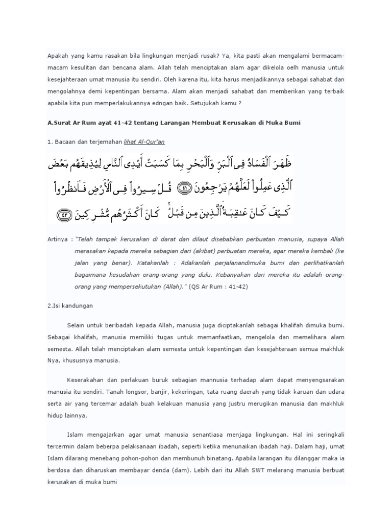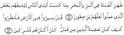 Ayat ini memberikan info kepada kita supaya kita sadar kerusakan di darat dan lautan karena ulah manusia, yaitu manusia yang tidak bertanggung jawab akan apa yang telah. Σa = jumlah ayat yang menggunakan kata yang sama. Verse no 41 of 60 arabic text, urdu and english translation from kanzul iman. قُلۡ سِيرُواْ فِي ٱلۡأَرۡضِ فَٱنظُرُواْ كَيۡفَ كَانَ عَٰقِبَةُ ٱلَّذِينَ مِن قَبۡلُۚ كَانَ أَكۡثَرُهُم مُّشۡرِكِينَ ٤٢. Telah nampak kerusakan di darat dan di laut disebabkan karena perbuatan tangan manusi, supay allah merasakan kepada mereka sebahagian dari (akibat) perbuatan mereka.